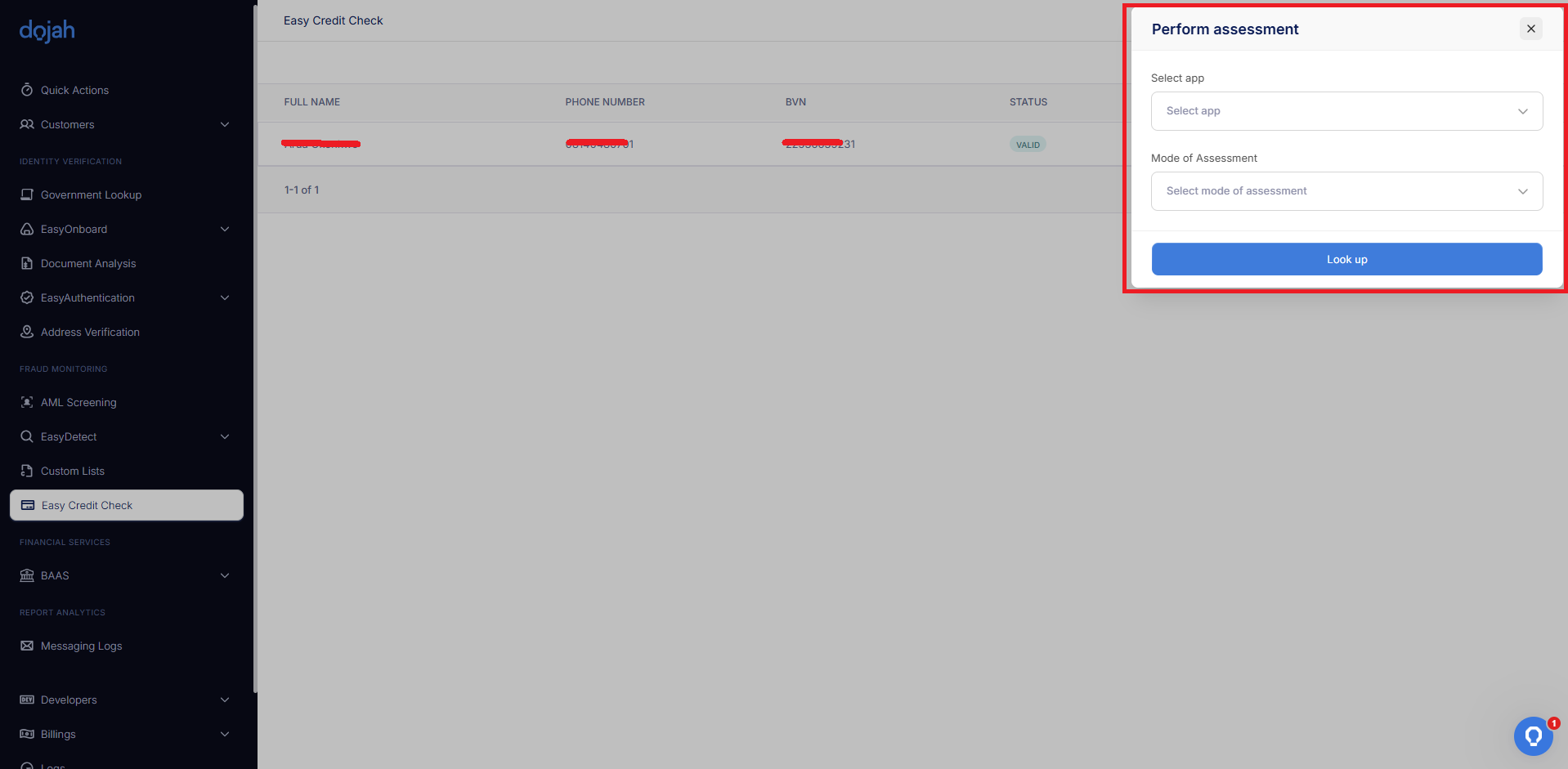 You start an assessment by clicking the “Perform Assessment” button. This opens a panel where you first select the app this check is for. Then, you choose one of two methods: either look up the customer directly using their BVN or generate a unique assessment link to send to the customer for them to complete.1