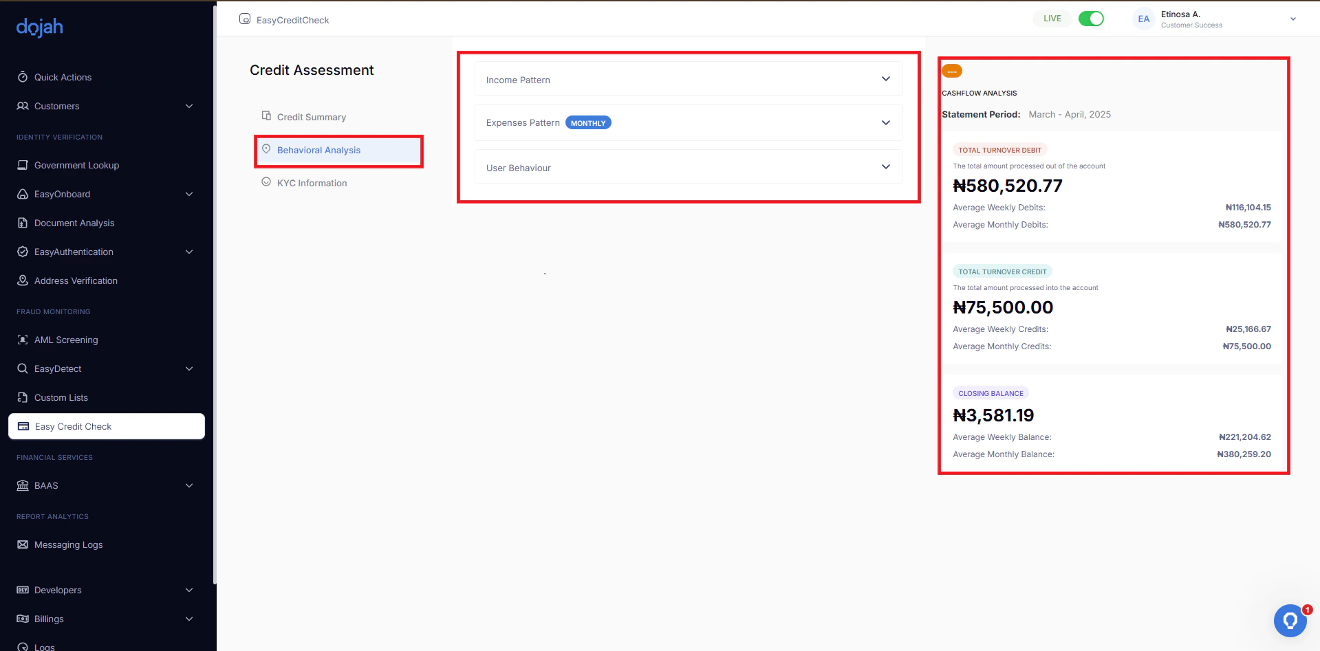 Once the statement is processed, the analysis covers the following areas:- Account Breakdown — Total credits, debits, average monthly and weekly balances, and the statement period covered.