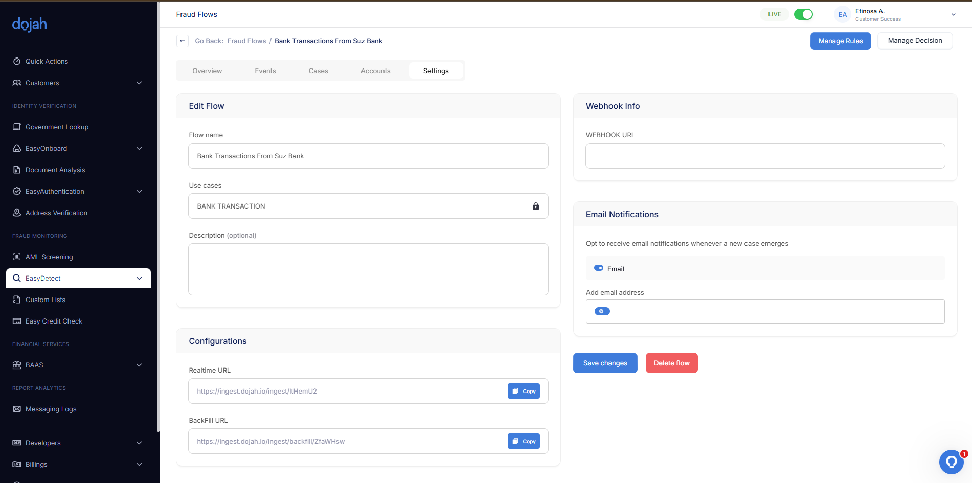 Configuration is done within the Settings tab of your flow dashboard. Here you can adjust metadata, define how final decisions are made based on risk scores in Managing Decisions, and build your logic in the Rule Editor.Settings