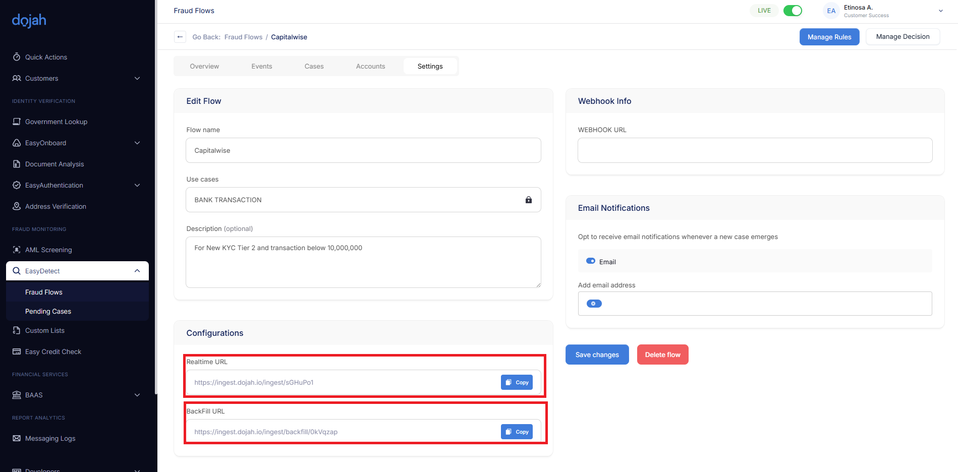 - This URL is used to send live events to your flow. Easy Detect will process these events in real-time against the rules you have set.