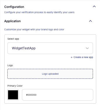 - Application configuration: This is the first and essential step in flow creation. Linking a verification flow to an app enables businesses to properly call and track APIs for user verification. It also allows businesses to customize the appearance of the widget by adding their company logo and brand colours.