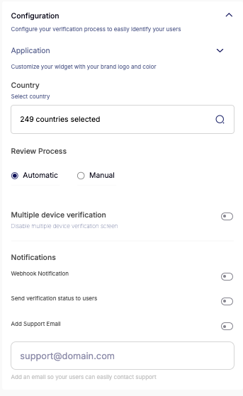 - Country configuration: It allows businesses to specify which countries are relevant for their user verification. Businesses are able to localize verifications for different user demographics.