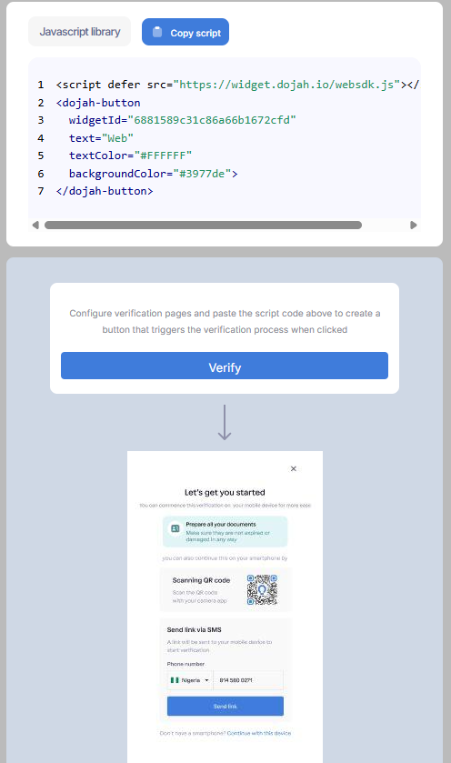 - Seamlessly embed the verification flow directly into your website or web application using our Web SDKs.
