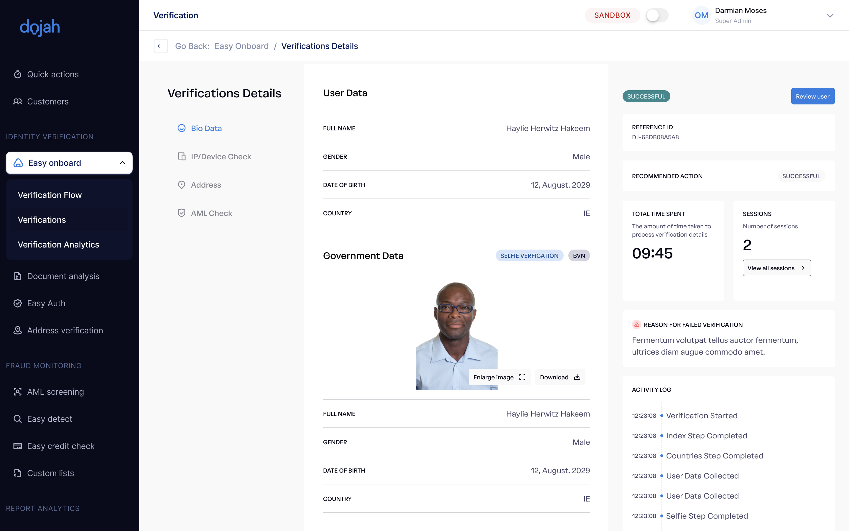 - Bio Data: This section contains all the user verification details collected via the widget, such as government data, uploaded government-issued ID, user data, and other verification pages.
