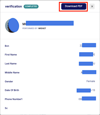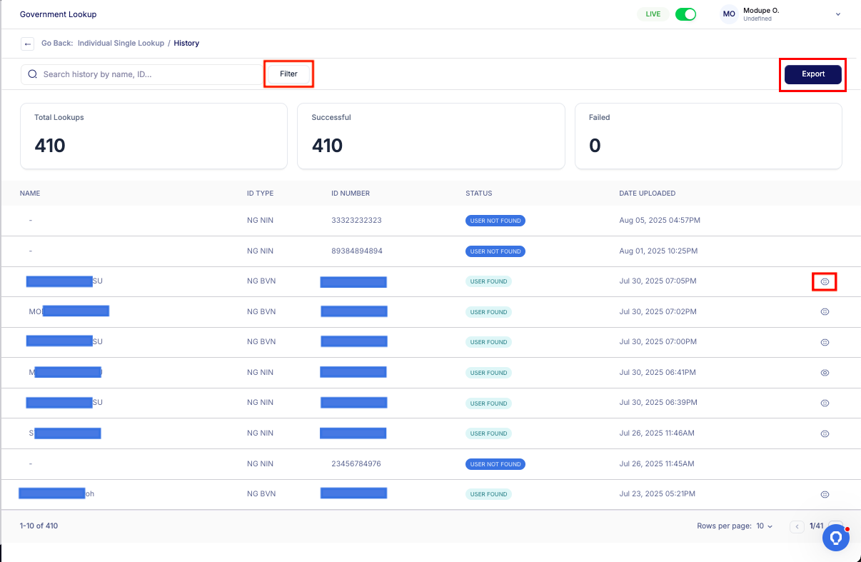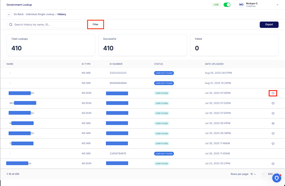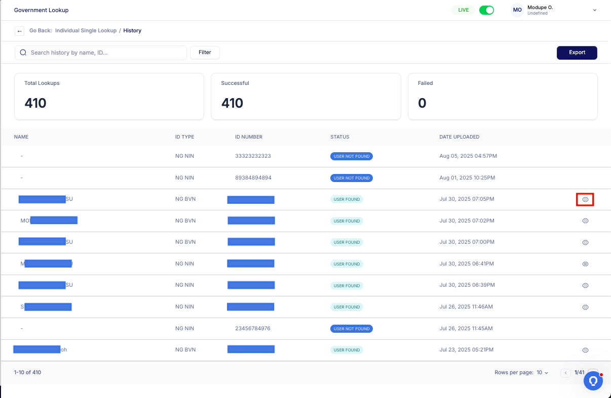 Click the eye icon beside a specific record to preview the lookup details, which can also be downloaded as a PDF.