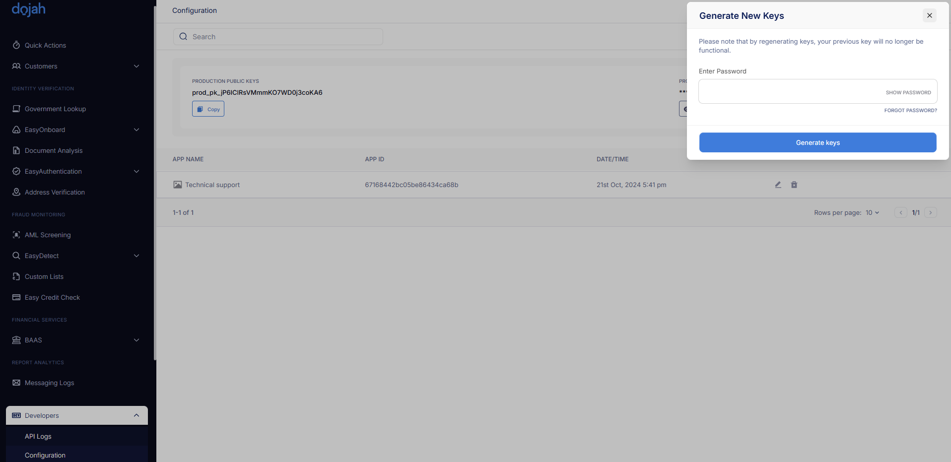 If the Dojah’s services is to be accessed outside the user application, you will need API keys. You can easily copy these keys from the configuration page. However, to view them, you will need to enter your password for security reasons. This is to prevent unauthorized access to your Dojah account.