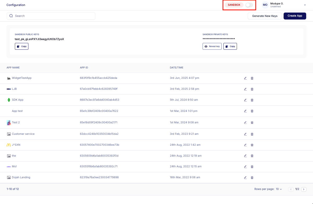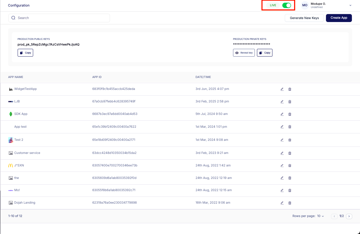 - The Live environment is the production-ready space where actual user data and real-time operations occur. Use this environment once your integration is ready to go live.
